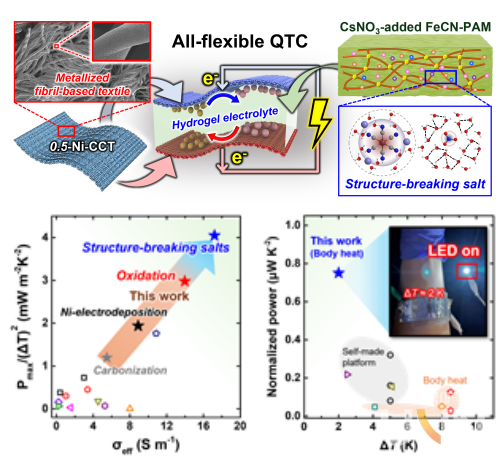 이번 연구는 과학기술정보통신부의 재원(나노·소재기술개발사업 – 소재글로벌영커넥트, 국가전략기술소재개발, 중견연구자지원사업)으로 한국연구재단의 지원을 받아 수행됐으며, 에너지 및 재료과학 분야 세계적 학술지 〈Advanced Energy Materials〉에 2월 18일자로 게재됐으며, 표지논문으로도 선정됐다. 해당 논문 ‘High-Performance Quasi-Solid-State Thermogalvanic Cells with Metallized Fibril-Based Textile Electrodes and Structure-Breaking Salts’는 최재진 박사과정생과 모정민 박사, 정재민 박사가 공동 1저자로, 한양대 장재영 교수와 고려대 조진한 교수가 교신저자로 참여했다.