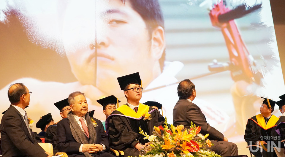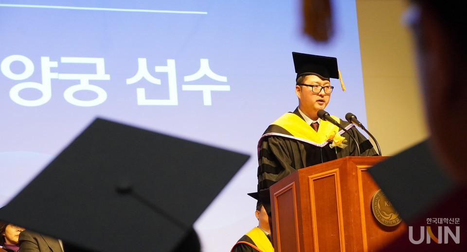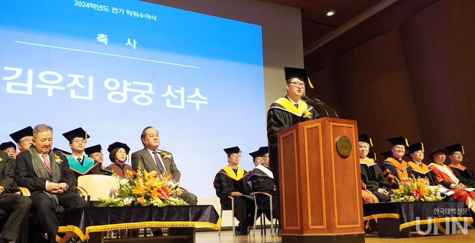 [한국대학신문 한명섭 기자] 파리올림픽 양궁 3관왕 김우진 선수가 19일 열린 국민대 학위수여식에서 축사를 했다.