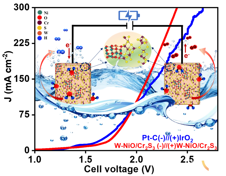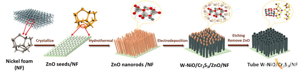 전극 지지체로 사용되는 니켈 폼(Ni foam) 위에 원자 단위로 텅스텐(W)을 도핑한 NiO/Cr2S3 나노튜브 이종구조를 합성했다. 이를 위해 전기도금(electrodeposition)과 에칭(etching) 공정을 결합한 혁신적인 합성 방법을 도입해 고성능 다기능성 전극 촉매를 구현했다.
