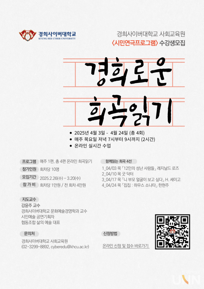[한국대학신문 이정환 기자] 경희사이버대학교(총장 변창구) 사회교육원(원장 김범정)이 2025년 상반기 새 학기를 맞아 더 한층 강화된 교육 프로그램을 선보이며, 수강생 모집을 시작한다. 경희의 근본 철학인 한방을 바탕으로 한 ‘경희동의보감교실’ 한방 약선·약초 과정과, 시민들이 예술을 체험하며 전인적 시민의식을 함양할 수 있도록 돕는 ‘경희로운 희곡읽기’ 과정이 새롭게 개설됐다. 이번 프로그램은 건강과 문화에 대한 깊이 있는 배움의 기회를 제공하며, 더 많은 시민들이 학문적 혜택을 누릴 수 있도록 기획됐다.