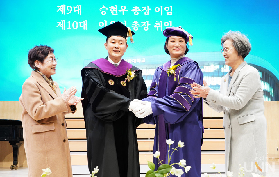 [한국대학신문 한명섭 기자] 서울여대 제10대 이윤선 총장의 취임과 제9대 승현우 총장의 이임을 기념하는 감사예배가 지난달 28일 교내 대강당에서 개최됐다.