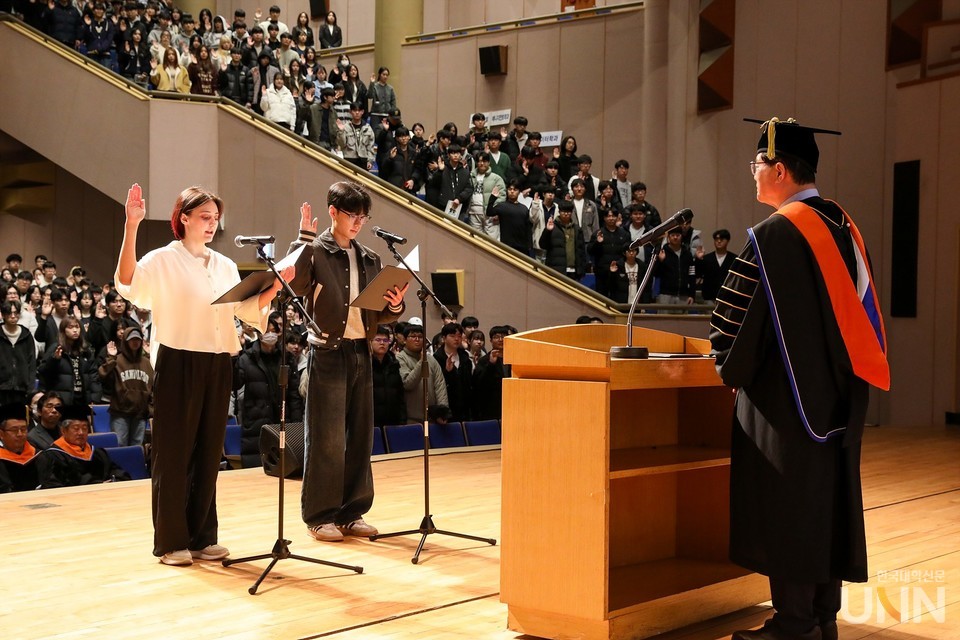 윤종원(한국·남, 외식조리학부), 다리아 아가포노바(Daria Agafonova·러시아·여, 자유전공학부)학생이 신입생 대표로 선서를 했다. 학생들은 학칙을 준수하고 학업에 충실하며 꿈과 비전을 키워나가겠다고 다짐했다.