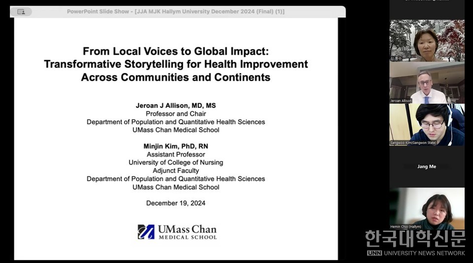 또 제3회 월간세미나에서는 매사추세츠대 의과대학 제론 앨리슨(Jeroan Allison) 부학장과 김민진 교수가 ‘지역의 목소리에서 글로벌 영향으로: 건강 개선을 위한 혁신적인 스토리텔링’이라는 주제로 일차의료와 만성질환 관리에 대한 강연을 진행했다. 매사추세츠대 의과대학과 간호대학은 일차의료 분야에서 미국 내 최고 수준의 시스템을 갖추고 연구성과를 내고 있으며, 제론 엘리슨 부학장은 이 분야에서 세계적인 명성을 얻고 있다. 한림대 글로벌프론티어리서치센터는 이번 세미나를 계기로 매사추세츠대와 함께 강원도와 미국 매사추세츠주의 일차의료 현장에서 고도화된 만성질환 관리 모델을 개발하는 연구를 시작했다.
