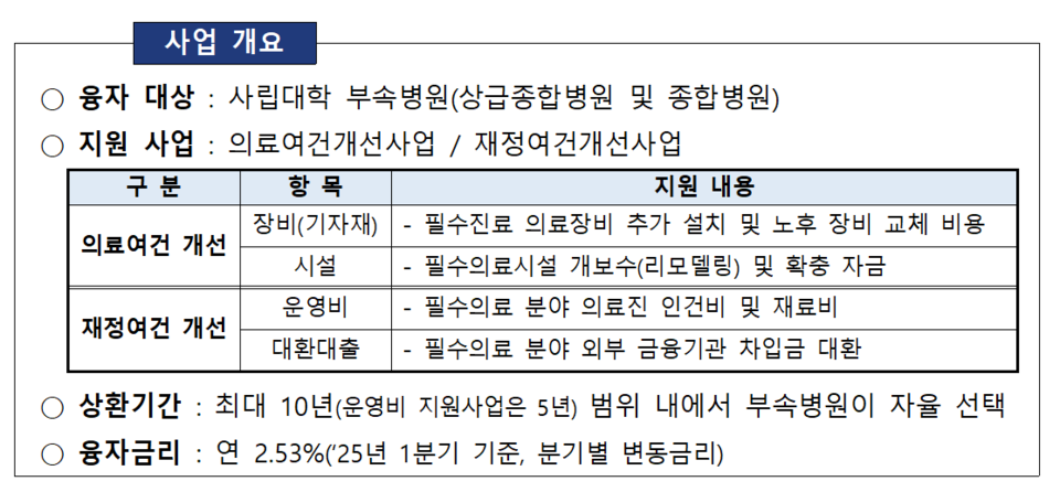 ‘병원 필수의료 역량 강화 지원 융자사업’은 사립대학 부속병원을 대상으로 국민의 생명과 직결되는 필수진료 인프라 유지·확충에 필요한 자금을 장기·저리로 융자 지원하는 신규 사업이다. 사립대 부속병원의 필수의료 분야 환경 개선을 지원한다.