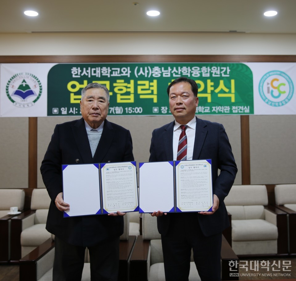 [한국대학신문 이정환 기자] 한서대학교(총장 함기선)는 17일 본교 자악관 3층 접견실에서 (사)충남산학융합원과 업무협약을 체결했다. (사)충남산학융합원은 충청남도의 지역산업 발전과 인재 양성을 위해 다양한 지원사업을 운영하고 중소기업과 대학 간의 협력을 통해 지역 경제의 활성화를 목표로 하는 기관이다.