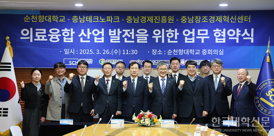 순천향대(총장 송병국)는 26일 오전 대학본관 3층 중회의실에서 충남테크노파크, 충남경제진흥원, 충남창조경제혁신센터와 함께 의료융합 신산업 발전을 위한 업무협약(MOU)을 체결했다.