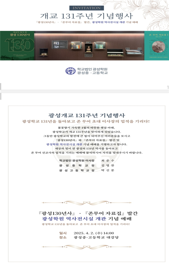 최준수 광성학원 이사장은 “131년의 역사를 통해 학교의 뿌리를 재조명하고, 존 무어 선교사의 선교정신을 계승해 한국 기독교 사학의 미래 방향을 제시하는 뜻깊은 자리가 될 것”이라고 밝혔다.