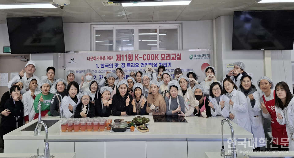 [한국대학신문 이정환 기자] 동남보건대학교(총장 김종완) K-COOK 요리교실은 세계 여러 나라 사람에게 전파하는 글로벌 요리 프로젝트로서 다문화적 교류와 소통의 중요한 역할을 하는 프로그램이다. 동남보건대는 최근 진행된 K-COOK 요리교실에서 수원시다문화가족지원센터와 협력해 외국인 20명을 대상으로 최근 유행하는 흑백요리사 방송을 통해 알려진 한국의 전통 장류(된장, 간장, 고추장)를 이용한 장트리오 요리와 인기 있는 디저트를 주제로 진행했다.