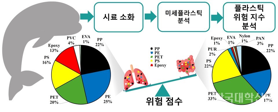 김태원 해양과학과 교수 연구팀은 상괭이의 폐 조직과 장 내용물에서 발견된 미세플라스틱을 비교 분석했다. 연구 결과 상괭이의 폐에서 장보다 더 많은 유독성 플라스틱이 검출된 것을 확인했다.