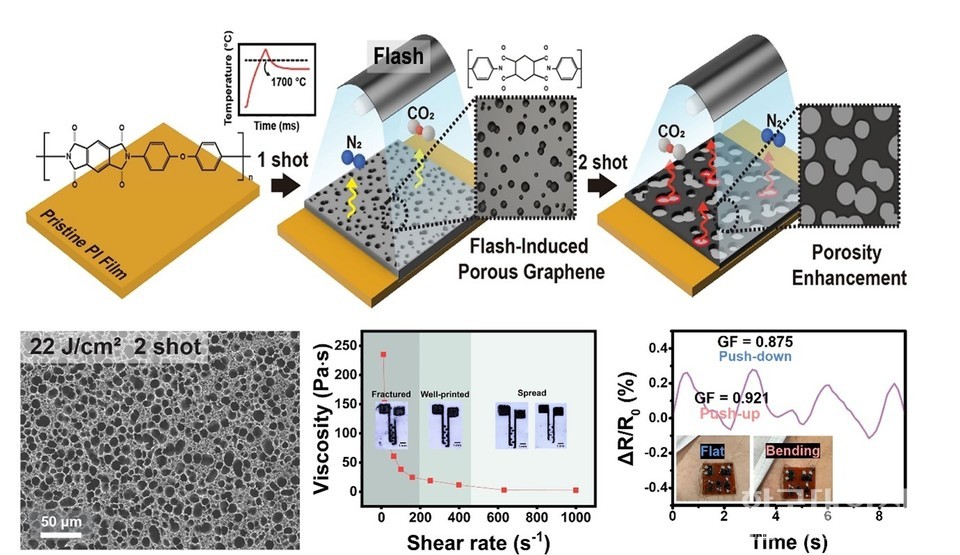박정환 교수 연구팀은 이러한 한계를 극복하기 위해 강한 플래시 광을 순간적으로 플라스틱 필름에 내리쬐어 내부 폴리머 구조를 변화시킴으로써, 수 밀리 초(10-3초, 0.001초) 이내의 초고속으로 넓은 면적의 그래핀 소재를 합성하는 데 성공했다. 또한, 플래시 광의 세기, 조사 시간/횟수 등을 세밀히 최적화함으로써, 고순도·고전도성의 3D 다공성 그래핀을 구현했다. 높은 공극률(재료나 물질 속의 빈공간이 얼마나 있는지 비율로 나타낸 것)을 갖춘 다공성 그래핀은 넓은 표면적을 가지고 있기 때문에 센서의 민감도를 향상시켜 우수한 감지 성능을 나타낸다.