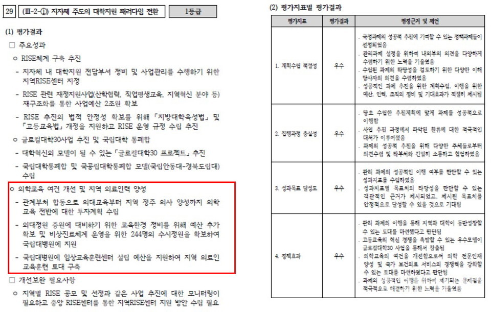 의대 사안은 ‘지자체 주도의 대학지원 패러다임 전환’ 과제(1등급)에서도 주요 성과로 제시됐다. 위원회는 “관계부처 합동으로 의대교육부터 지역 정주 의사 양성까지 의학교육 전반에 대한 투자계획 수립”에 대해 높은 평가를 했으며, “의대정원 증원에 대비하기 위한 교육환경 정비를 위해 예산 추가 확보 및 비상진료체 운영을 위한 244명의 수시정원을 확보해 국립대 병원에 지원”, “국립대병원에 임상교육훈련센터 설립 예산을 지원해 지역 의료인 교육훈련 토대 구축”도 높은 평가의 근거가 됐다.