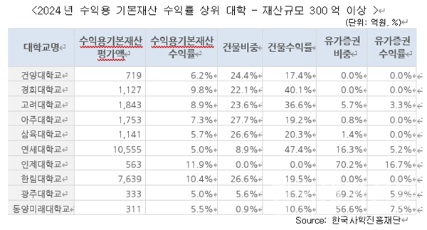 수익용 기본재산 수익률 현격히 떨어지는 대학들, 자산 관련 운영 전문성 역량 및 투자 운영 노하우 부족 지적 나와
