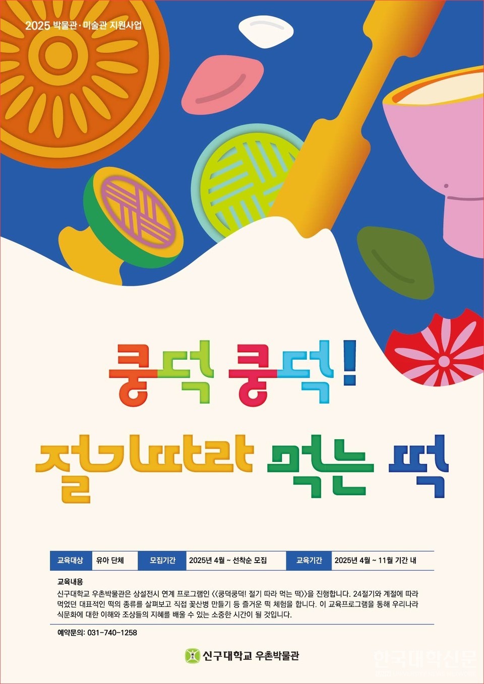 [한국대학신문 이서혜 기자] 신구대학교 우촌박물관(관장 한경식)은 2025년 박물관·미술관 지원사업의 일환으로 유아 단체를 대상으로 ‘쿵덕쿵덕! 절기 따라 먹는 떡’교육프로그램을 운영한다. 5월부터 11월까지 총 25회 진행된다.