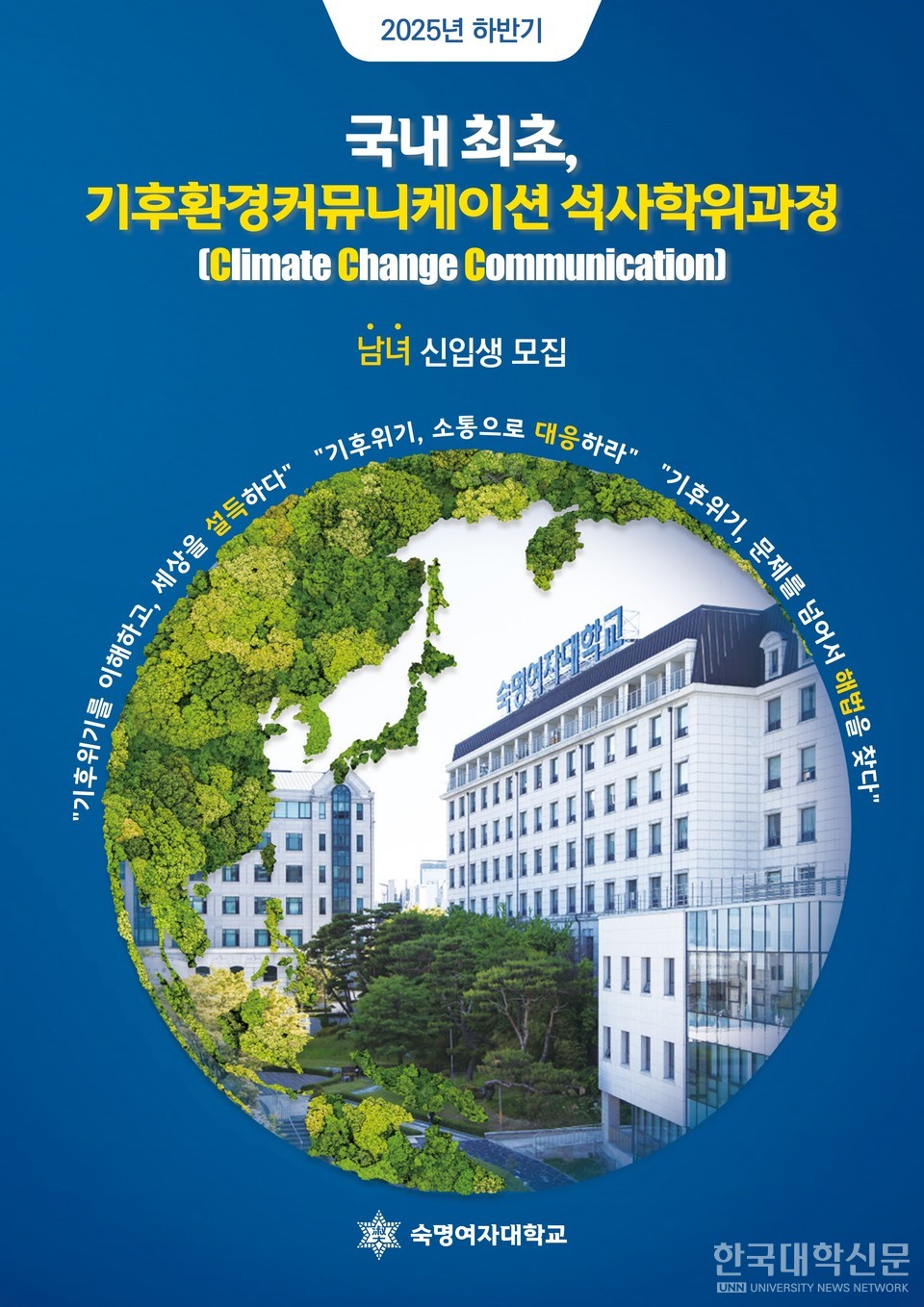 [한국대학신문 김윤미 기자] 숙명여자대학교(총장 문시연)가 국내 최초로 기후환경커뮤니케이션 전공 석사과정을 신설하고 2025학년도 후기 신입생을 모집한다. 국내에서 해당 분야 석사과정이 개설된 것은 이번이 처음이다.