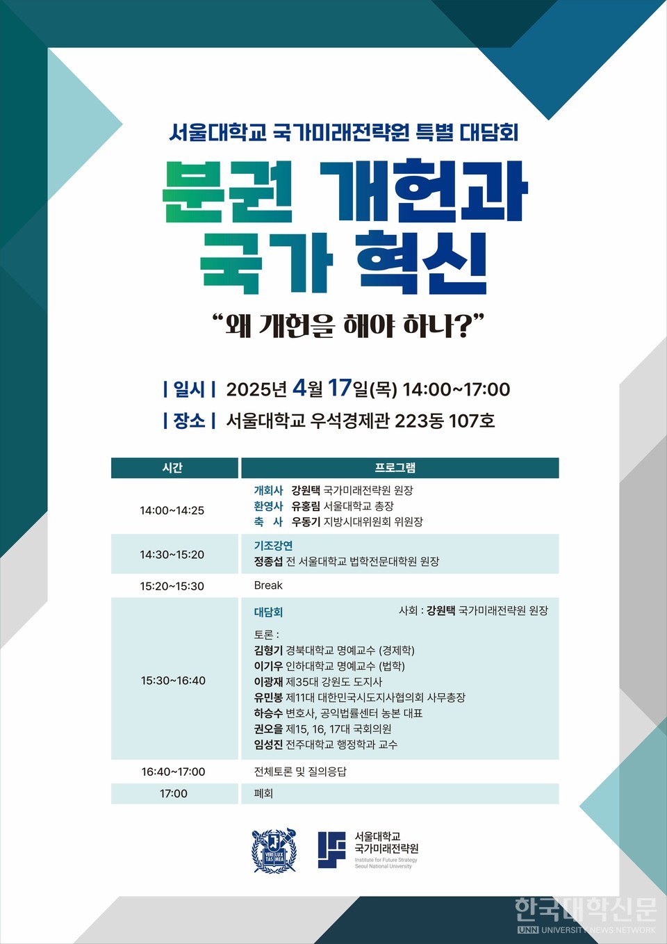강원택 국가미래전략원장은 “비상계엄 선포와 대통령 탄핵으로 발생한 한국 민주주의의 위기를 극복하고, 지역 소멸과 인구감소 등 국가적 위기를 극복하기 위해서는 대통령과 중앙정부에 집중된 권한을 나누는 분권형 개헌이 반드시 필요하다”며 “서울대 국가미래전략원은 이러한 시대적 과제를 해결하기 위한 학문적 논의와 정책적 해법을 함께 모색할 수 있는 공론의 장을 이번뿐만 아니라 앞으로도 계속해서 마련할 것”이라고 밝혔다.