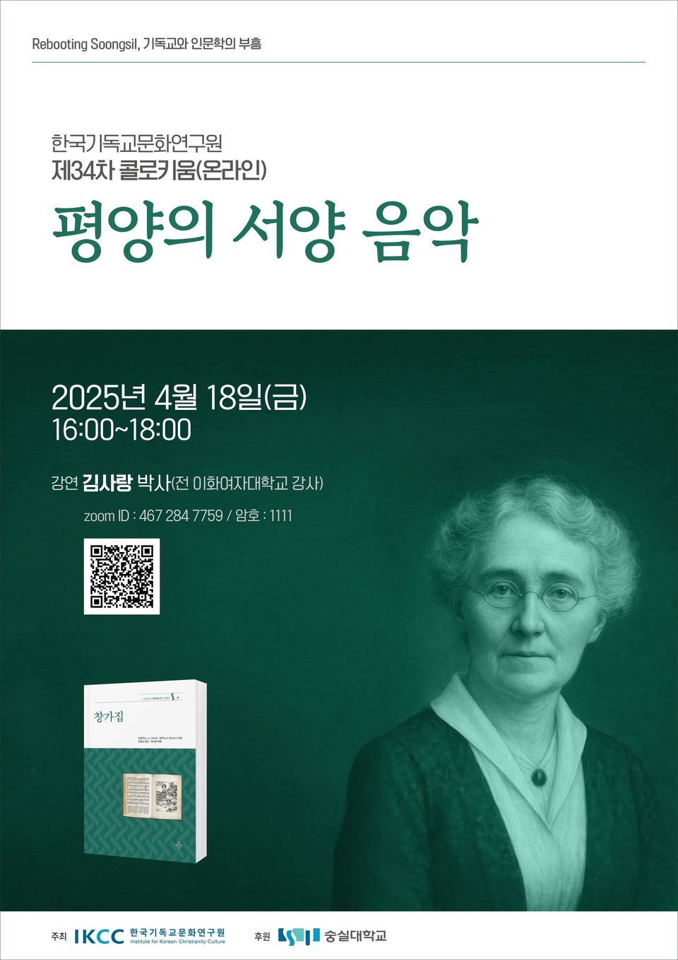 [한국대학신문 문화춘 기자] 숭실대학교 한국기독교문화연구원(원장 장경남)은 18일(금) 오후 4시 제34차 콜로키움을 비대면으로 개최한다고 밝혔다. ‘평양의 서양 음악’을 주제로 열리는 이번 콜로키움에서는 이화여자대학교 김사랑 박사의 초청 강연이 진행된다. 강연에서는 숭실대를 설립한 윌리엄 베어드의 부인 애니 베어드(Annie Laurie Adams Baird, 안애리, 1864~1916)를 중심으로, 서양 음악의 국내 유입 과정 속 초기 한국 기독교 찬양곡의 양상에 대해 살펴볼 예정이다.