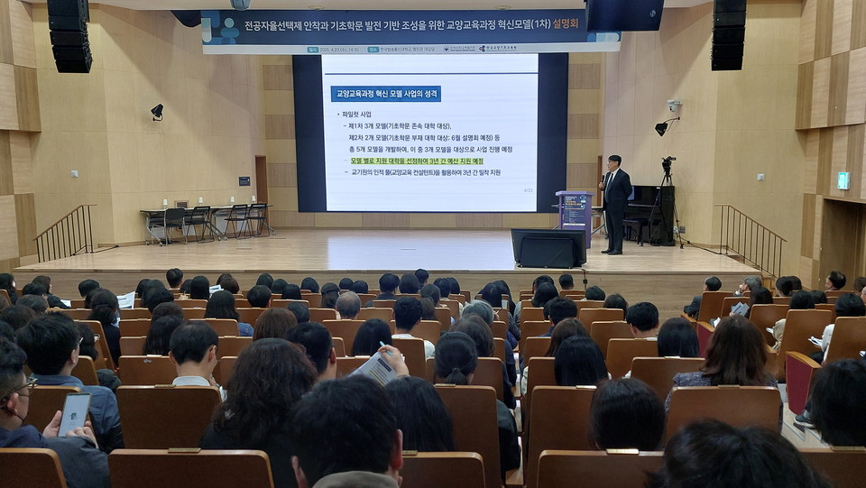 한국대학교육협의회(회장 양오봉, 이하 대교협) 부설 한국교양기초교육원(이하 교기원)은 23일 한국방송통신대 열린관 대강당에서 전국 197개 회원대학을 대상으로 ‘전공자율선택제 안착과 기초학문 발전 기반 조성을 위한 교양교육과정 혁신모델(1차)’ 설명회를 열었다.