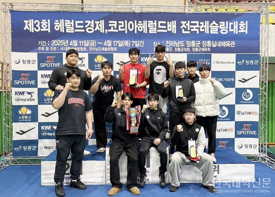 [한국대학신문 문화춘 기자] 영남대학교(총장 최외출) 레슬링부가 또 한 번 전국 무대에서 압도적인 기량을 과시하며 단체 종합우승을 차지했다. 지난 3월 제43회 회장기 전국레슬링대회에서의 종합우승에 이어, 4월 14일 전라남도 장흥군에서 개최된 ‘제3회 헤럴드경제·코리아헤럴드배 전국레슬링대회’에서도 단체 종합우승을 거머쥐며 두 대회 연속 정상에 올랐다.