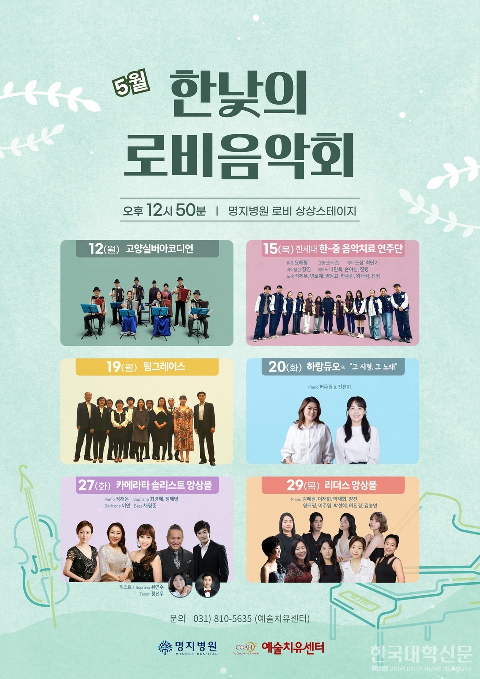 ‘한낮의 로비음악회’ 공연은 명지의료재단이 2008년 국내 의료기관 최초로 설립한 ‘예술치유센터’의 예술치료 프로그램 중 하나로, 입원 환우와 보호자, 내원객, 의료진의 정서적 안정을 위한 문화 치유 활동이다. 해당 공연은 2003년부터 시작해 지금까지 2000회 이상 개최돼 환자 중심의 치유 문화 조성에 기여하고 있다.