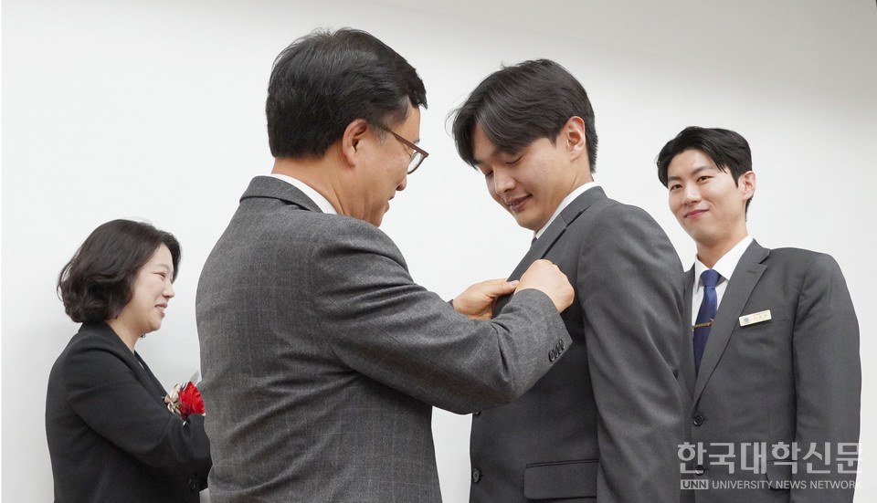 신입생 대표들에게 선서를 받은 김광만 총장이 이한나 학과장과 윙 뱃지를 달아 주고 있다.(맨 위, 두번째)