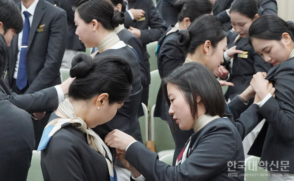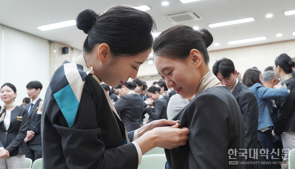 윙 수여식은 교수들과 2학년 선배가 1학년 후배들에게 승무원을 상징하는 날개 모양의 배지를 유니폼에 달아주며 승무원으로서의 자세와 다짐을 되새기는 행사.