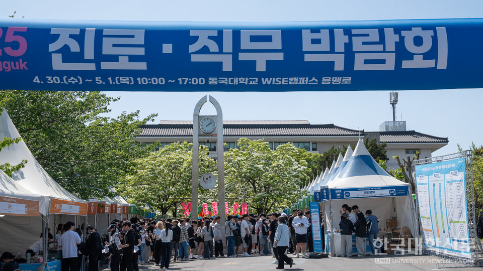[한국대학신문 이정환 기자] 동국대학교 WISE캠퍼스 대학일자리플러스센터(센터장 하성)는 30일부터 1일까지 교내 용맹로 야외부스에서 ‘2025 WISE Dongguk 진로·직무박람회: 선배이즈백’을 성황리에 개최했다.