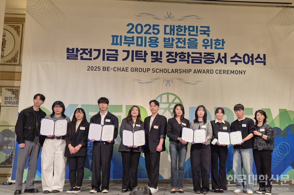 [한국대학신문 심정은 기자] 연성대학교 뷰티스타일리스트과 스킨케어전공이 지난달 27일 서울 청담동 그랜드 머큐어 앰배서더 호텔에서 열린 ㈜약손명가 빛채그룹 주최 ‘2025 대한민국 피부미용 발전을 위한 발전기금 기탁 및 장학금 증서 수여’ 행사에 참여했다.