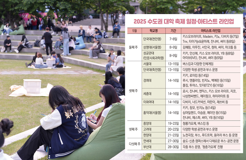 ■ 5월 둘째 주… 성균관대·상명대 등 = 단국대학교 천안캠퍼스는 7~8일 대동제를 개최한다. 다채로운 부스와 각종 행사가 열리는 가운데 키스 오브 라이프, MADEIN, 다비치, 잔나비, 타이거JK&윤미래, 싸이 등의 아티스트 공연을 준비했다.