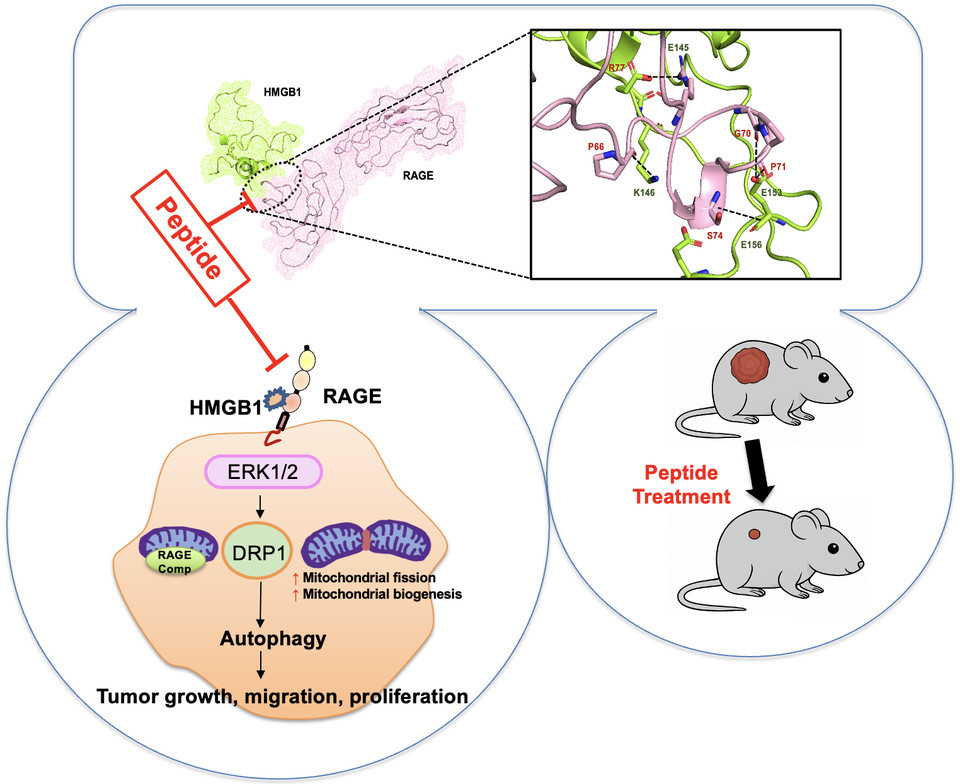 (좌측 하단) 이 결합을 차단하는 새로운 펩타이드는 RAGE 매개 ERK1/2 및 DRP1 신호전달 경로를 억제해 미토콘드리아 분열과 자가포식을 차단하고, 결과적으로 암세포의 증식·이동·생존을 억제했다.