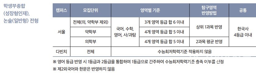 두 전형 모두 전형요소별 반영 비율은 논술 70%, 교과 20%, 비교과(출결) 10%로 이를 합산한 점수로 학생을 선발한다. 전형 간 중복지원도 가능하다.