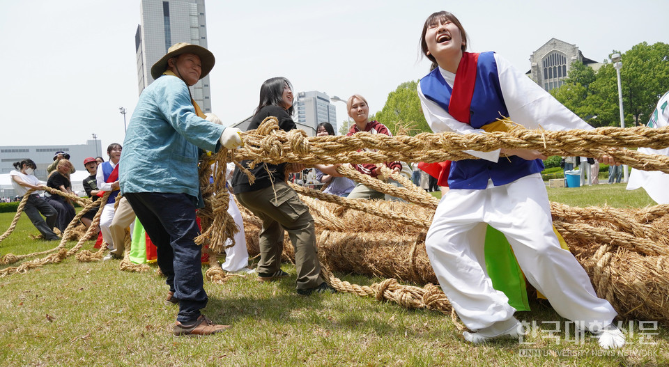 [한국대학신문 한명섭 기자] "영차 영차"...국가무형유산 영산줄다리기 행사가 14일 이화여대 대동제에서 재연됐다.