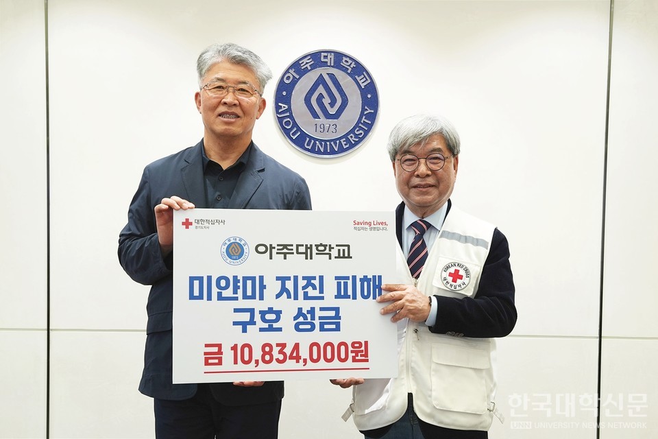 [한국대학신문 박인규 기자] 아주대학교는 15일, 미얀마 지진 피해 복구를 위한 성금을 대한적십자사 경기도지사에 전달했다. 이번 성금은 대한적십자사를 통해 미얀마의 지진 피해 복구 지원에 사용될 예정이다.