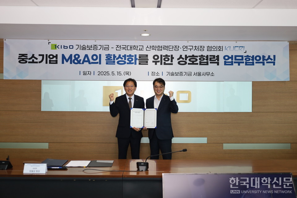 [한국대학신문 이정환 기자] 전국대학교 산학협력단·연구처장 협의회(회장 장철성 강원대학교 산학협력단장)는 15일 서울 여의도 63빌딩 내 기술보증기금 서울사무소 회의실에서 기술보증기금(이사장 김종호)과 ‘중소기업 M&A의 활성화를 위한 상호협력 업무협약(MOU)’을 체결했다.