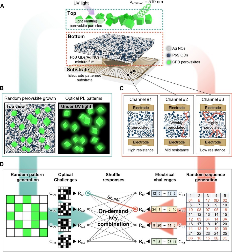 이러한 한계를 해결하고자, 공동 연구팀은 하나의 장치 안에 전기적·광학적 특성을 동시에 갖춘 PUF 소자를 개발했다. 비전도성 양자점과 전도성 나노입자를 정밀하게 조절해 나노 수준의 무작위성을 지닌 하이브리드 박막을 제작하고, 이를 전극 위에 형성해 무작위 전도 특성을 확보했다. 또한, 양자점 표면에서만 형성되는 페로브스카이트를 활용해 불규칙한 광학 패턴을 구현하여, 두 가지 물리적 무작위성을 보유한 고보안 암호화 장치를 완성했다.