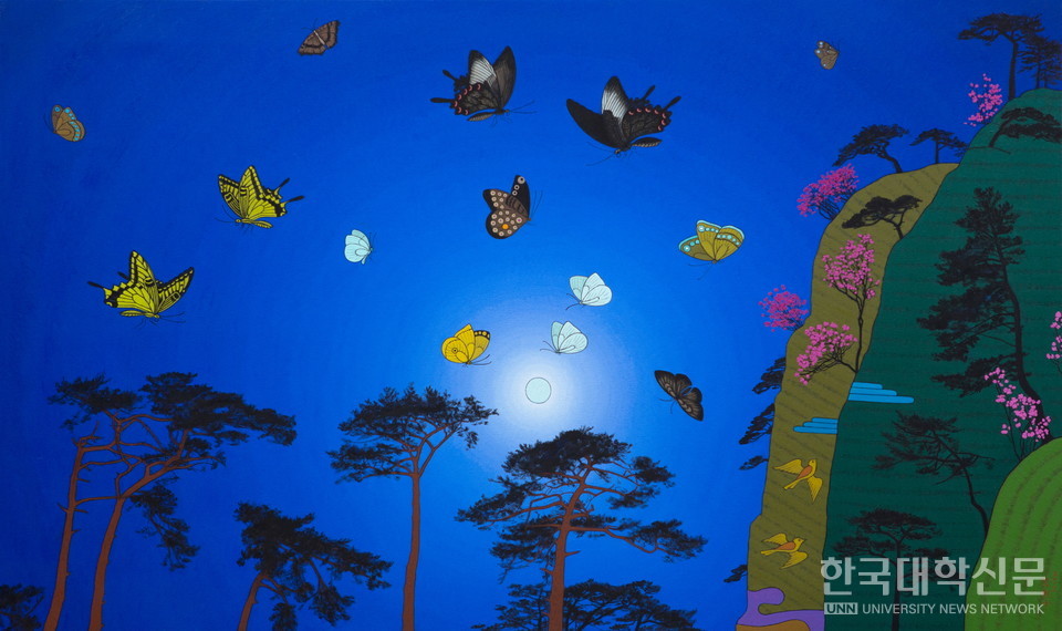 석운 故이희중은 용인대 회화과 교수 및 문화예술대학 학장을 역임했으며, 민화, 불화, 고구려 벽화 등 우리 전통의 이미지들을 단순히 복원하거나 재현하는 것을 넘어, 창조적 재구성의 경지를 선보이는 작품을 펼쳐왔다. 그의 작품 속에 반복적으로 등장하는 산, 나비, 우주, 용 등의 형상은 현실의 풍경이 아니라 작가 내면의 ‘심상(心象)’으로 구현된다. 이를 통해 관람자는 자연과 우주, 인간과 영혼이 교차하는 상징적이면서도 몽환적인 이미지 세계에 들어서게 된다.