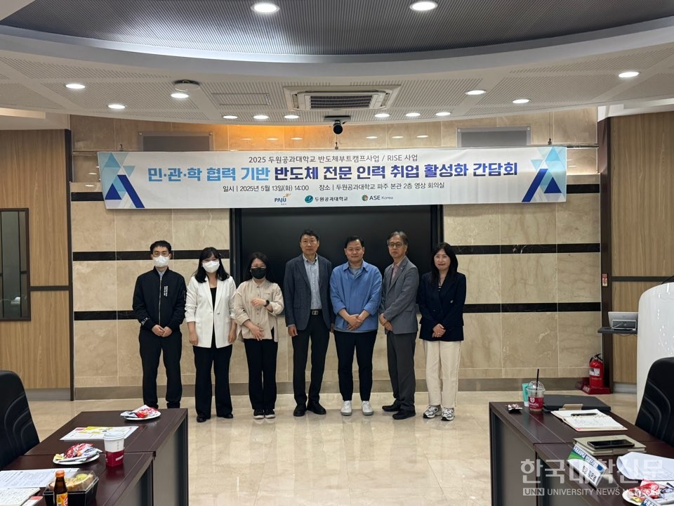 [한국대학신문 김영성 기자] 두원공과대학교(총장 임해규) 반도체 부트캠프사업단(이하 사업단)은 지난 13일 파주캠퍼스와 20일 안성캠퍼스에서 각각 간담회를 열고, 지역 기업·지자체·지역 기업지원기관과의 실질적 협력체계 구축에 나섰다.