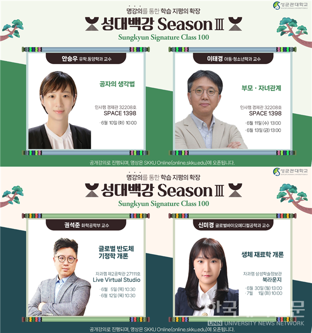 한편, 성균관대는 오는 6월에서 7월에 걸쳐 ‘성대백강 시즌 3’ 특강을 개최할 예정이다. 기초 학문부터 첨단 융합 분야에 이르는 다양한 강좌를 선보일 예정이며, 시즌 3 역시 강연 이후 온라인 콘텐츠로 제작해 공개함으로써 지식의 공유와 확산을 이어갈 계획이다.