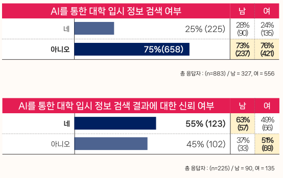 그러나 AI를 ‘대입 정보 검색’에 활용한 수험생은 많지 않았다. 응답자의 25%만 ‘AI로 대학 입시 정보를 검색해본 적이 있다’고 답했다. AI 검색 결과의 신뢰도를 묻는 문항에서는 의견이 엇갈렸다. 입시 정보를 검색할 때 AI를 활용한 수험생들 중 55%는 검색 결과를 ‘신뢰한다’고 답했지만, 45%는 ‘신뢰하지 않는다’고 답했다.