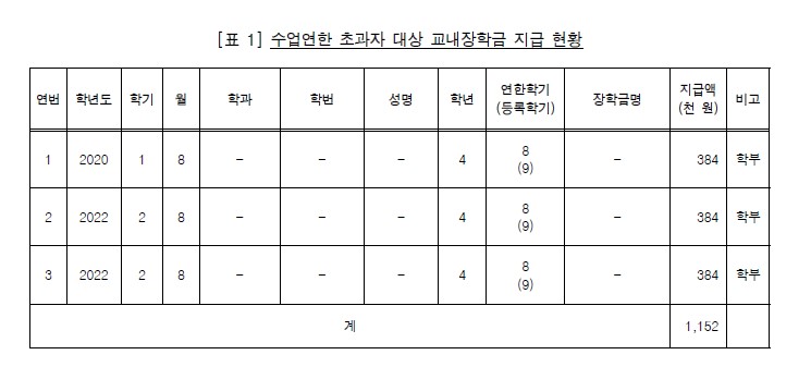 ■ 수업연한 초과자에 장학금… 유학 장학생도 내부 규정 어겨 선발 = 감사 결과, 전북대는 수업연한 4년을 초과한 학부생 3명의 수업 기간을 확인하지 않고 장학금 총 115만2천 원을 지급했다. 또한 2021학년도 1학기에는 교육조교 장학생 2명이 2개월간 근무한 사실이 없음에도 근무 사항 이상 여부를 확인하지 않고 담당처에도 제출하지 않아, 총 108만 원의 장학금을 지급한 사실도 확인됐다.