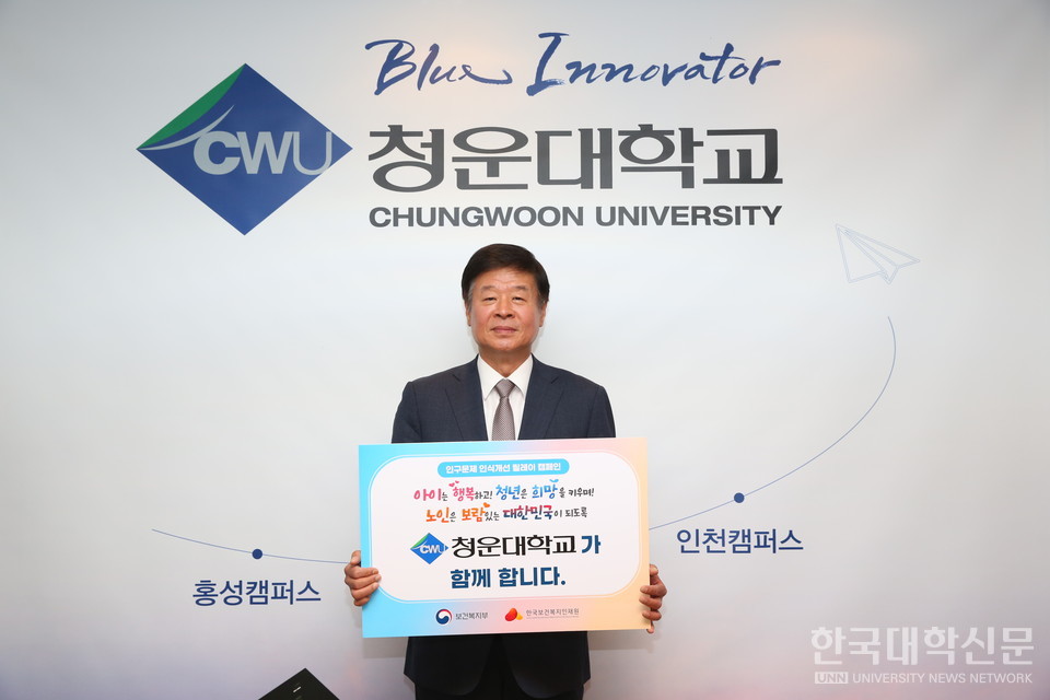 [한국대학신문 김윤미 기자] 청운대학교 정윤 총장은 보건복지부와 한국보건복지인재원에서 주관하는 ‘인구문제 인식개선 릴레이 캠페인’에 동참했다고 12일 밝혔다.