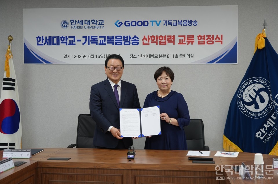 [한국대학신문 이정환 기자] 한세대학교(총장 백인자)는 미디어영상광고학과(학과장 송민정) 주관으로 기독교복음방송 GOODTV(이하 GOODTV, 대표사 김명전)과 인재 양성과 미디어 선교 협력 및 공동사업 추진 등을 위해 산학협력 교류 협정식을 16일 본관 회의실에서 개최했다.