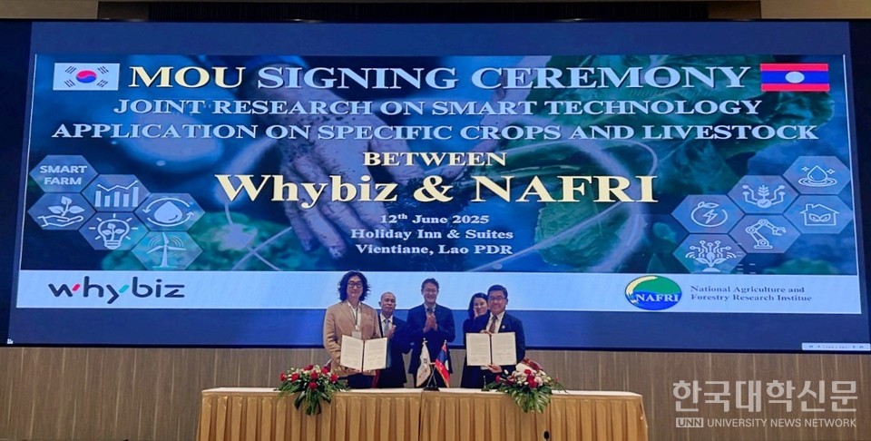 [한국대학신문 김연주 기자] 숭실대학교(총장 이윤재)는 벤처중소기업센터 입주기업 ㈜와이비즈가 지난 12일 라오스 농업산림연구청(NAFRI) 및 라오스 국립대학교 농업학부(Faculty of Agriculture, National University of Laos)와 스마트팜 기술 기반의 농업 공동연구 추진을 위한 업무협약(MOU)을 체결했다고 밝혔다.