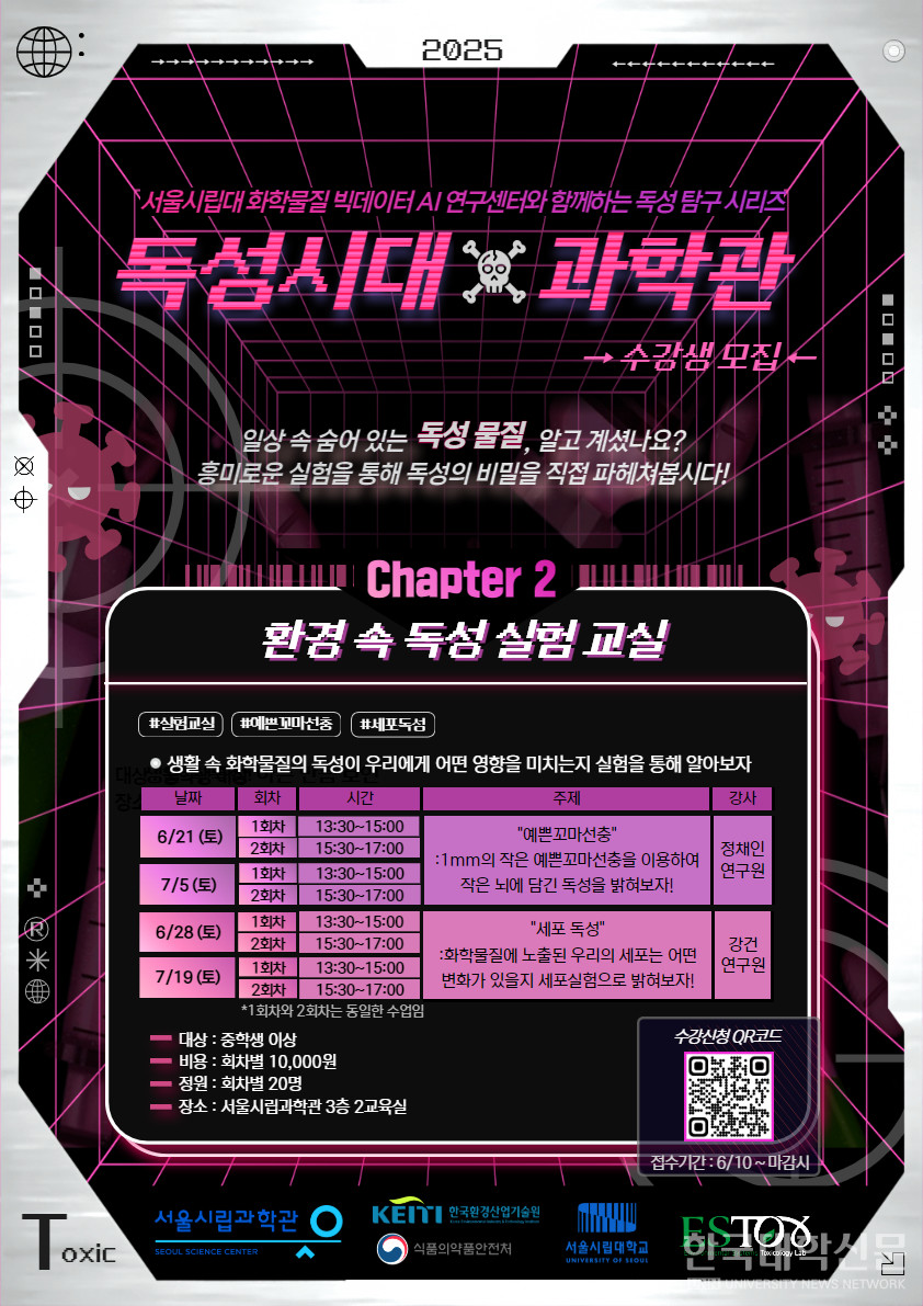 [한국대학신문 문화춘 기자] 서울시립대학교(총장 원용걸) 화학물질빅데이터 AI(인공지능) 연구센터(센터장 최진희 교수)는 서울시립과학관과 협력해 생활화학제품 및 환경 중 유해 화학물질의 독성에 대한 과학적 이해를 돕는 프로그램 ‘독성시대 인(IN) 과학관’을 오는 8월 9일까지 운영한다고 19일 밝혔다.