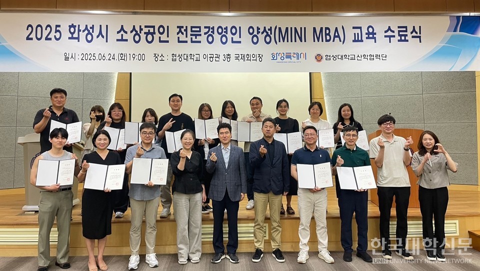 [한국대학신문 이정환 기자] 협성대학교 산학협력단(단장 박남수)은 지난 24일, 협성대 이공관 국제회의장에서 ‘2025 화성시 소상공인 전문경영인 양성(MINI MBA) 교육’ 수료식을 성황리에 개최했다.