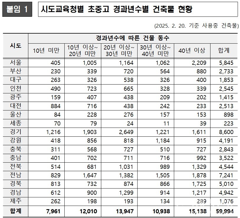 김 의원이 교육부로부터 제출받은 「전국 초·중·고 학교 건축물 현황(2025년 2월 기준)」 자료에 따르면, 2025년 2월 기준 전국 초·중·고에서 사용 중인 건축물은 총 5만 9994동이며, 이 가운데 30년 이상 경과된 건물은 2만 6076동(43.5%)에 달한다. 특히 40년 이상 된 건물만 해도 1만 5138동으로 전체의 25.2%에 이른다.