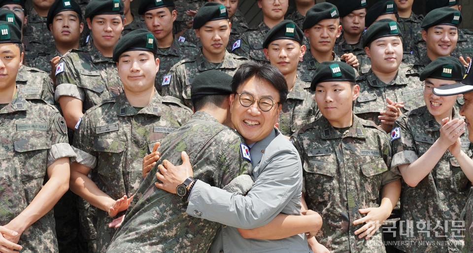 신고를 받은 류 총장이 한두희 후보생 대표(에너지전기공학4)를 뜨겁게 안아주며 격려하고 있다.(두번째)