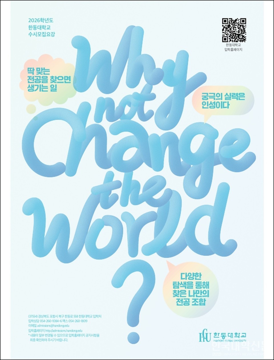 [한국대학신문 이정환 기자] 한동대학교(총장 최도성)가 2026학년도 수시모집에서 총 3개의 전형을 새롭게 신설하며, 평가 방식과 모집 단위에서도 의미 있는 변화를 함께 도입한다고 발표했다. 이번 변화는 성적 중심 선발에서 벗어나 학생의 잠재력과 융합 역량을 중시하는 교육철학을 반영한 것으로 평가된다.