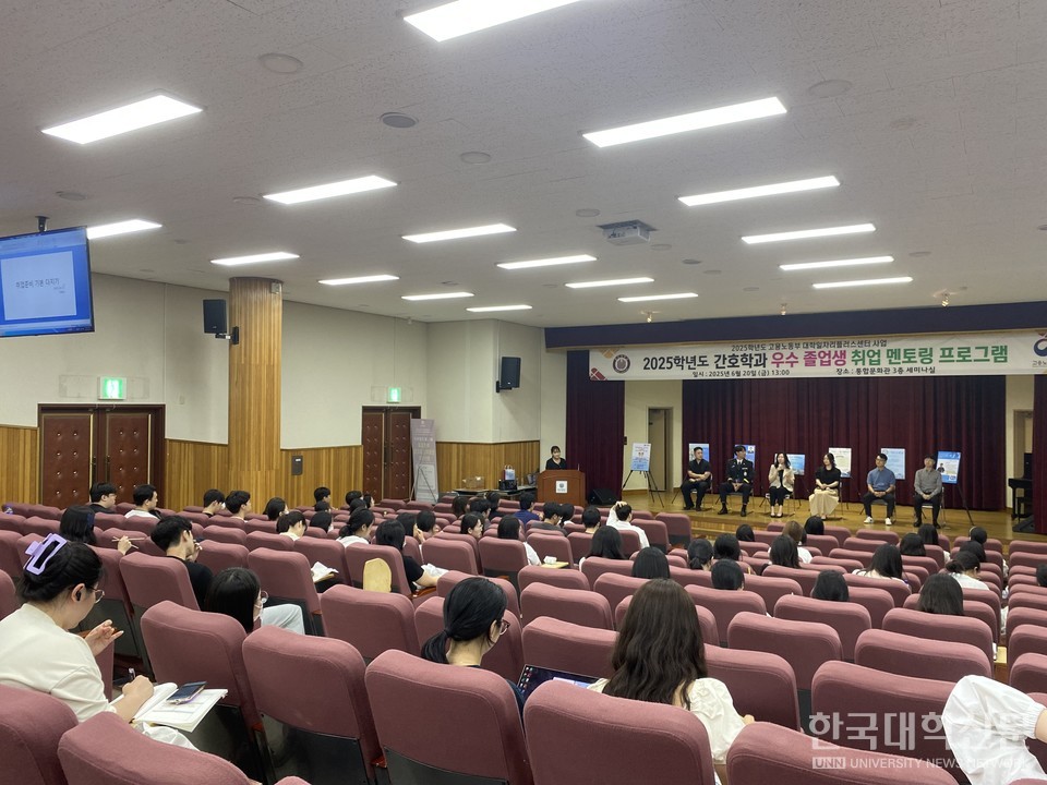 [한국대학신문 이서혜 기자] 호산대학교(총장 김재현) 간호대학은 2025년 고용노동부 대학일자리플러스센터 사업의 일환으로 지난달 20일 졸업생이 재학생 4학년을 대상으로 2025년 ‘우수졸업생 멘토, 맨티 취업 프로그램’ 을 진행했다. 이 프로그램은 현재 임상에서 활동하고 있는 졸업생이 예비졸업생 4학년을 대상으로 졸업생의 경험과 지식을 활용해 재학생의 성장을 지원하는 프로그램 이다.