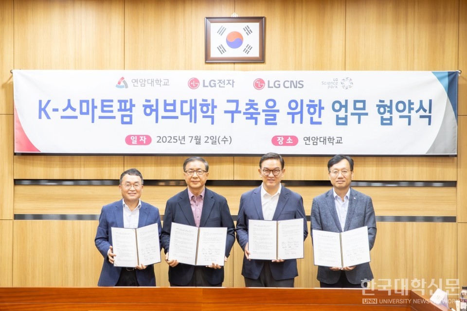 [한국대학신문 이서혜 기자] 연암대학교(총장 육근열)는 2일 본관 회의실에서 LG전자, LG CNS, LG사이언스파크와 함께 ‘K-스마트팜 허브대학’ 구축을 지원하기 위한 다자간 업무협약(MOU)을 체결했다고 밝혔다.