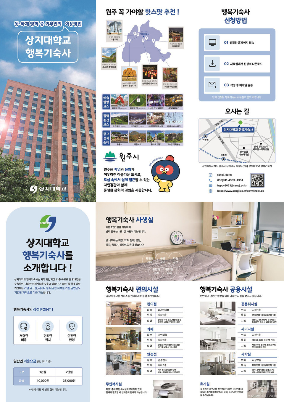 [한국대학신문 이정환 기자] 상지대학교(총장 성경륭)는 여름방학을 맞아 교내 행복기숙사를 일반인에게 개방한다. 상지대는 매년 동계 및 하계 방학 기간 동안 기숙사를 외부에 개방해 지역사회와 공간 공유를 실천하고 있으며, 올해 하계 운영 기간은 8월 22일까지다.